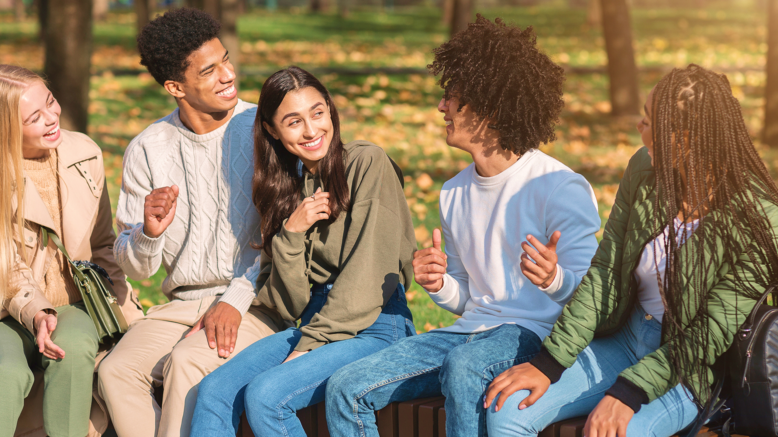 Group of young adults sitting on a park bench, smiling and talking, surrounded by autumn leaves and trees in the background